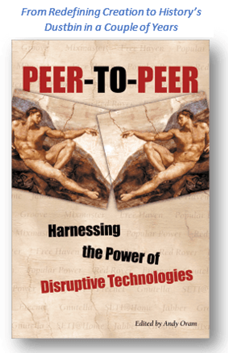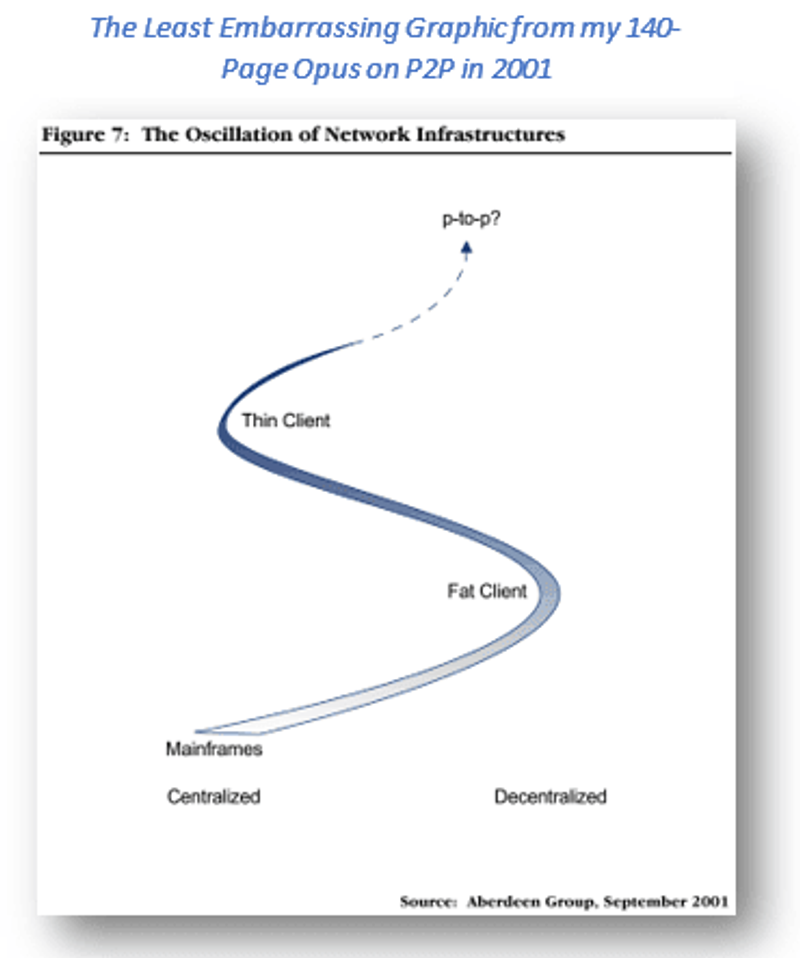 With that ignoble crash in hindsight, even my conservative and skeptical publications on the subject look embarrasingly optimistic in retrospect. I’ll omit the embarrassing hockey stick market growth projections here. But one phrase from the report remains true: “after the hype dies down, there will be no more companies claiming to be P-to-P companies. Rather, there will be content delivery, high-end processing, collaboration, and information infrastructure companies using P-to-P technologies.”